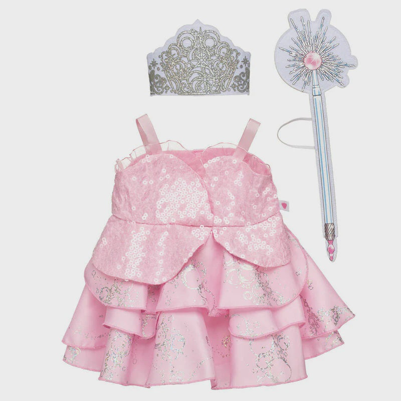 Transform your furry friend into Glinda the Good with this three-piece Wicked Glinda costume for stuffed animals. The set includes her signature pink dress with ruffles, a royal crown and a sparkly wand wristie.